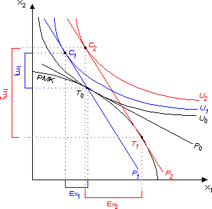 Nach Aufnahme von Außenhandel gilt aber die Preislinie des Weltmarktes P1. Durch Gütertausch mit dem Ausland, indem die Menge EX1 von x1 exportiert und IM1 von x2 importiert wird, kann jetzt bereits das höhere Nutzenniveau U1 erreicht werden (Handelsgewinn). Nun werden aber die Produzenten ihre Produktion dem neuen Preisverhältnis anpassen. Für sie ist es vorteilhaft, die Produktion solange zu Gunsten des nun teureren Guts x1 zu verlagern, bis die Grenzrate der Transformation wieder gleich der Preislinie ist. Der Produktionspunkt wandert auf der Transformationskurve von T0 nach T1. Dem entsprechend muß auch die Preislinie verschoben werden, so daß sie durch den neuen Produktionspunkt verläuft (Das Einkommen wird nun durch T1 bestimmt). Dem Land ist es nunmehr möglich, durch Export der Menge EX2 von x1 und Import von IM2 Einheiten x2 das Nutzenniveau U2 zu erreichen (Spezialisierungsgewinn).
