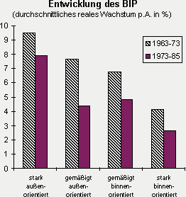 Darüber hinaus beschränke der nicht oder schwach wachsende Exportsektor die Investitionsgüterimporte. Letztere müssen um einer ausgeglichenen Handelsbilanz Willen mit den Exporteinnahmen bezahlt werden. - Wegen 7.) wird somit die Investitionstätigkeit und letztendlich das Wachstum behindert.
