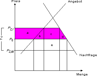 In dem Fall eines kleinen Landes, das keinen Einfluß auf den Weltmarktpreis hat, muß nur der eingefärbte Bereich aus Abbildung 2.2 betrachtet werden. (In diesem Fall sind Pz,w und Pz,i auf gleichem Niveau vorzustellen.) Es kommt zu einem Wohlfahrtsverlust von a - (a+b+c+d) +c = -(b+d). (Harberger Dreiecke)