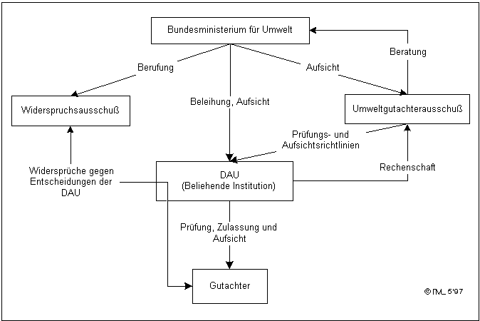 Die Oberaufsicht über das Zulassungssystem für Gutachter hat das Bundesumweltministerium. Es ernennt und beaufsichtigt die Zulassungsstelle und ihm unterstehen der Umweltgutachter- und der Widerspruchsausschuß. Während die Ausschüsse öffentlich-rechtlich organisiert sind, wurde als Zulassungsstelle mit der Deutschen Akkreditierungs- und Zulassungsgesellschaft für Umweltgutachter mbH (DAU) ein privates Unternehmen beauftragt. Dieses wird getragen von den Wirtschaftsverbänden, dem Bundesverband der Deutschen Industrie (BDI), dem Deutschen Industrie und Handelstag (DIHT), dem Zentralverband des Deutschen Handwerks (ZDW) und dem Bundesverband freier Berufe (BFB).26 Die Zulassungsstelle wickelt die eigentliche Prüfung, Zulassung und Überwachung der Gutachter ab.